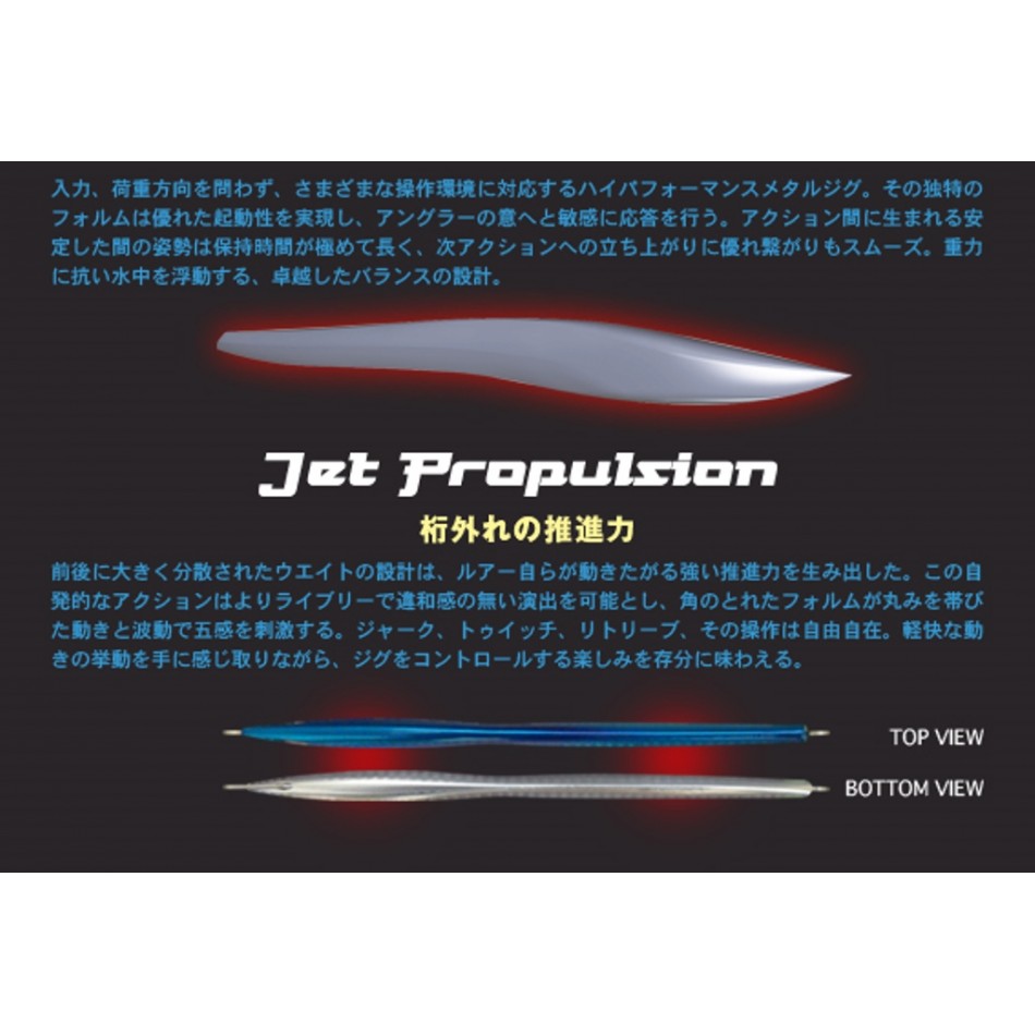 High performance metal jig corresponding to various operating environments from vertical to shallow cast & jerk regardless of input and load direction. The unique form realizes superior startability and responds swiftly to the strategy that Angler's meaning. Automatic action requiring no difficult operation from continuous operation of swimming system using spinning tackle to basic one pitches. The stable posture that is born during operation is extremely long in retention time, superior to the rise to the next action Smooth connection of actions. Floating to resist gravity, excellent balance design.